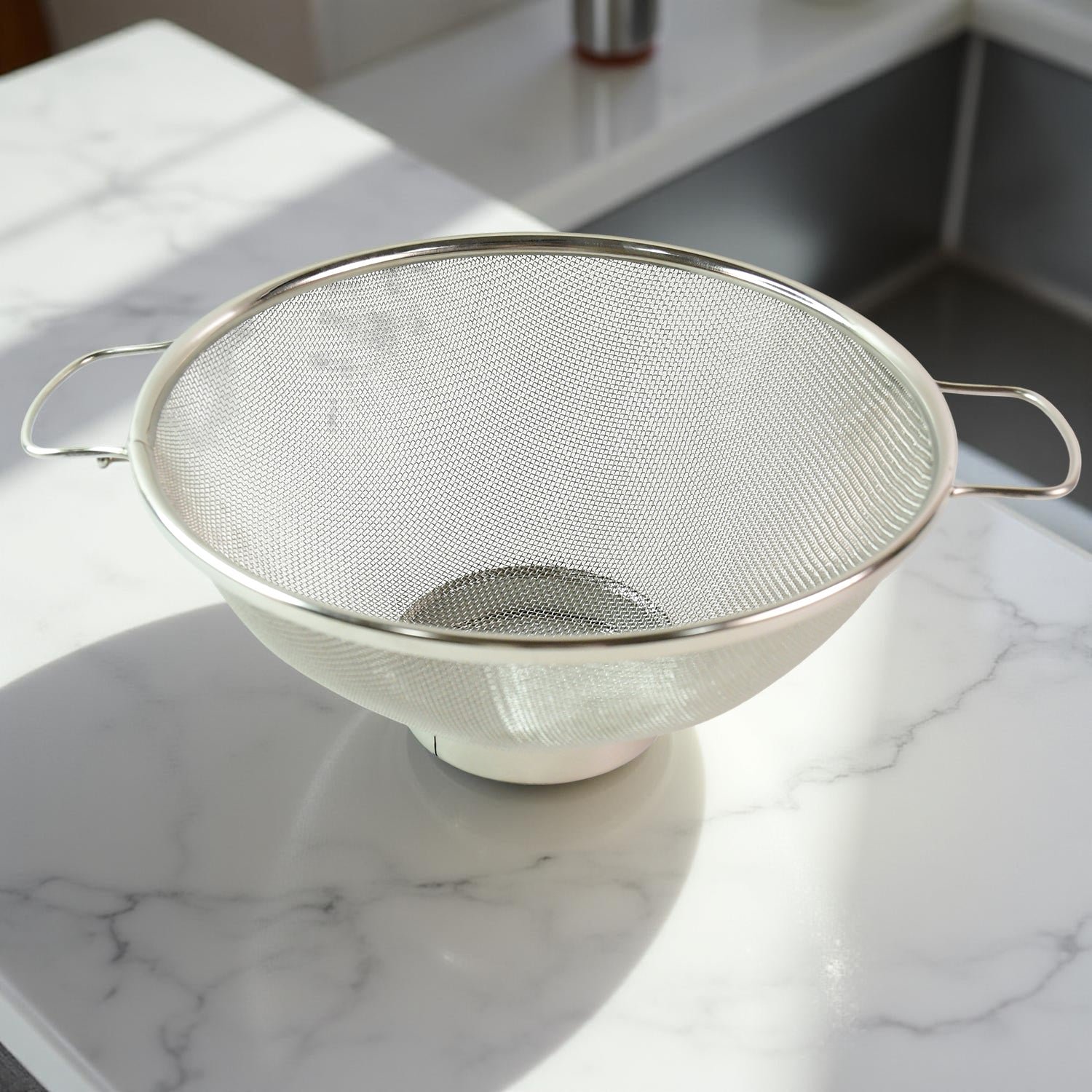 Make food prep quick and efficient with this Stainless Steel Mesh Colander. Designed with a fine mesh for thorough rinsing and draining, it?s perfect for washing fruits, vegetables, rice, and straining pasta. Crafted from quality, rust-resistant stainless steel, this colander is built for daily use and lasts longer than plastic alternatives. The sturdy base and easy-grip handles ensure stability and comfort while draining. A must-have kitchen essential for cooking, rinsing, and prepping with ease.